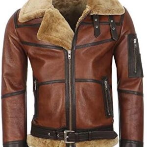 Hollert Bomberjack voor heren, B16, model 6, kastanje/crème, Sylvester stijl, winterjas, 100% merino bontjas, leren jas