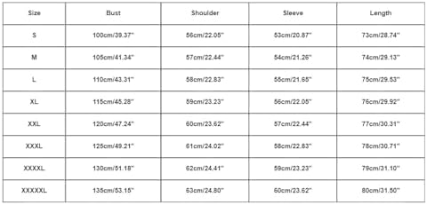 Maat: XXXXL mislukking: 130 cm/51,18 ” schouder: 62 cm/24,41 ” mouw: 59 cm / 23,23 inch lengte: 79 cm / 31,10 inch