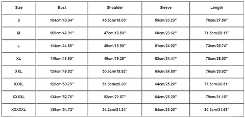 Maat: XXXXL mislukking: 134 cm / 52,76 inch schouder: 53 cm / 20,87 inch mouw: 64 cm / 25,20 inch lengte: 79 cm / 31,10 inch