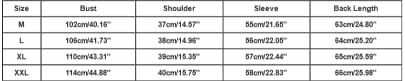 Maat: L Mislukking: 106cm/41.73” Schouder: 38cm/14.96” Mouw: 56cm/22.05” Ruglengte: 64cm/25.20”