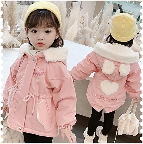 Modieus ontwerp: de outdoorjas van dit meisje heeft een trekkoord ontwerp in de taille, een hartpatroon op de achterkant en een berenoor ontwerp op de capuchon dat modieus en nieuw is.